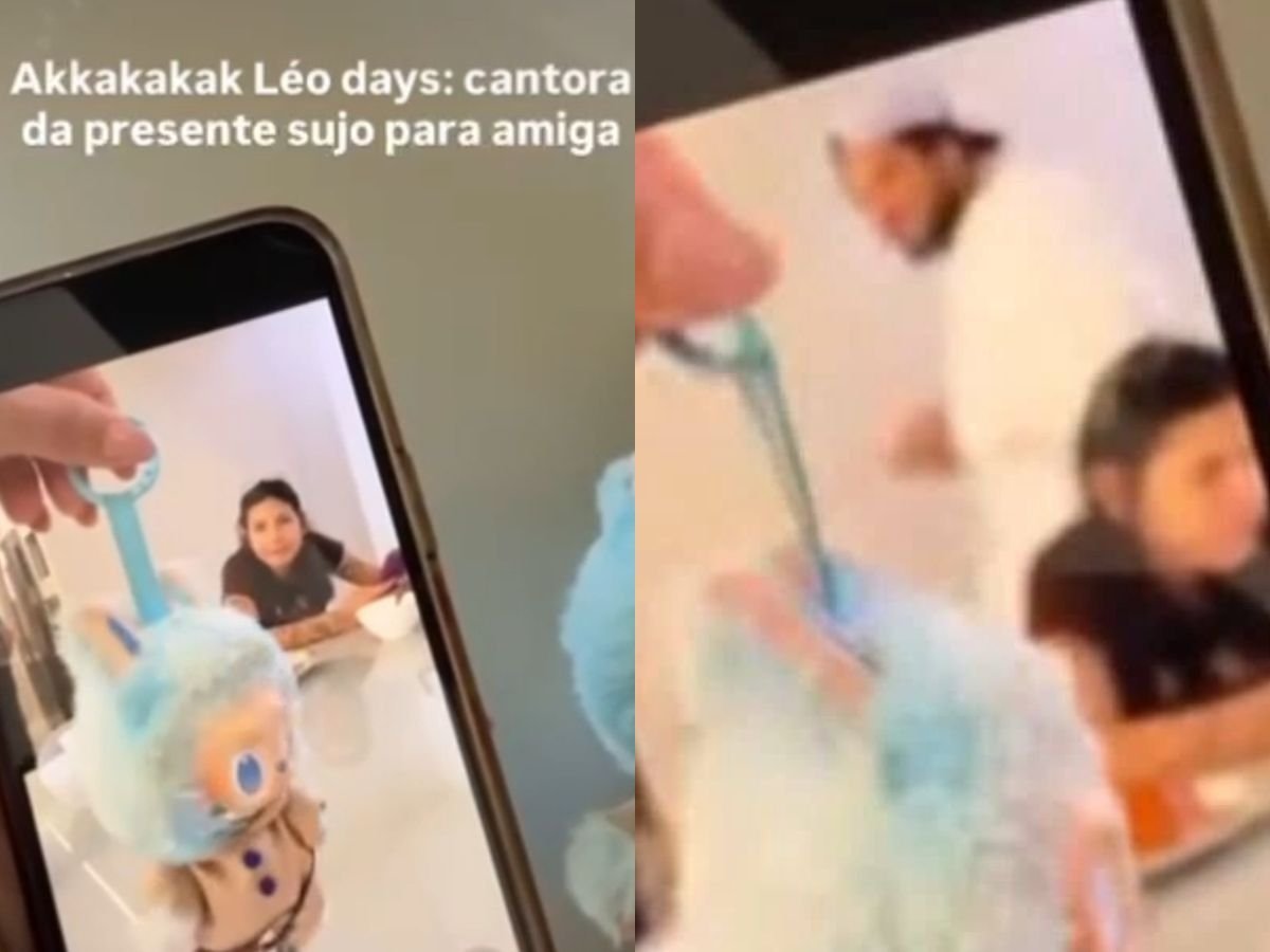 Na imagem, a amiga da Boiadeira estaria apenas mostrando o Labubu que ganhou de presente da cantora; mas talvez não estava contando que o ex de Virginia Fonseca passaria na frente da câmera do celular bem no momento da gravação.