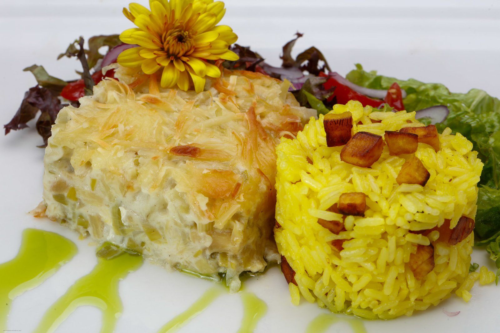 Lagostão: Isca de Peixe (tradicional isca de peixe crocante do Lagostão) e Bacalhau de Sant’ Anna (bacalhau em lascas, batatas em cubos, molho bechamel e muçarela gratinada, acompanhado por arroz de açafrão com banana da terra e salada de folhas com tomate cereja finalizado com azeite verde);