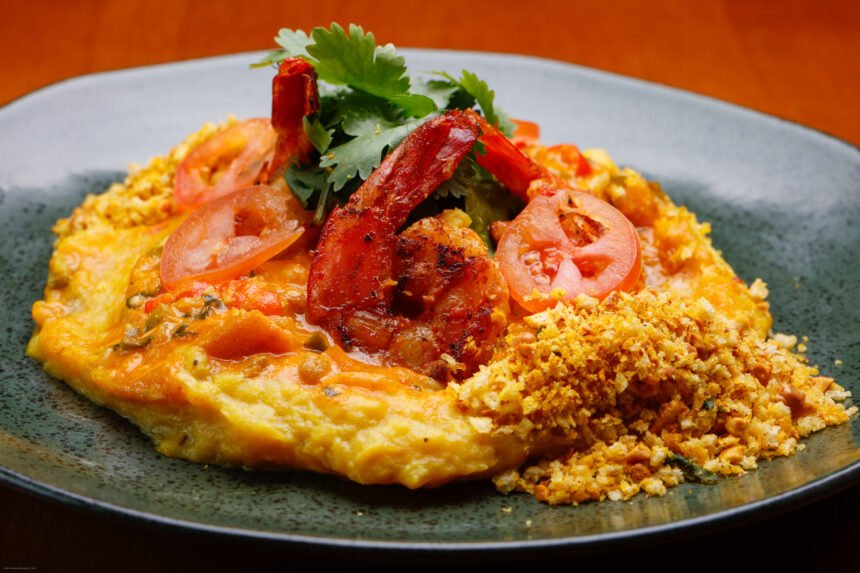 Gêmeos: Crocante Terra e Mar (bolinho de banana-da-terra recheado com camarão) e Moqueca de Camarão (camarões frescos no leite de coco artesanal, pimentões coloridos, pimenta e azeite de dendê);