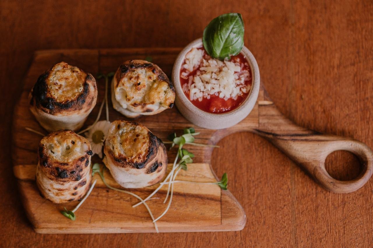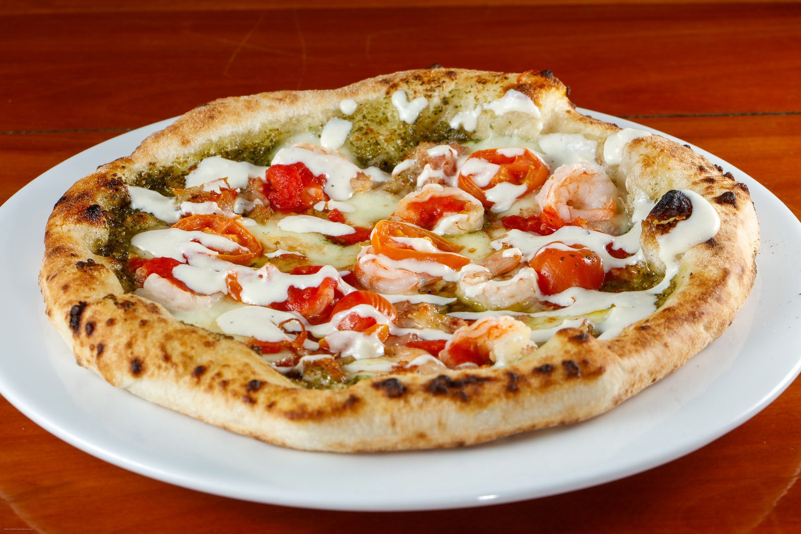 Vicoli: Rotolina de calabresa com catupiry (rolinhos de massa de pizza, com calabresa artesanal italiana e catupiry) e Terra e Mare (pizza napolitana com pesto de manjericão, muçarela de búfala, pancetta curada e camarões VM, finalizada com fonduta de scamorza defumada e grana padano 12 meses);