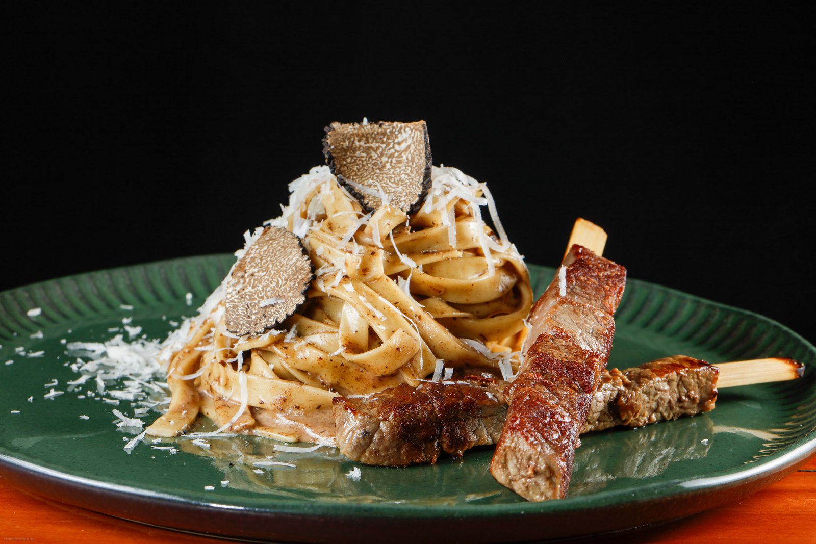 Trattoria do Nutte: Caponata da Nonna (caponata de beringela, pasta de tomate, uvas passas e azeitonas, servida com uma crocante massa branca com alecrim) e Tartufi Divini (talharim artesanal com molho à base de funghi porccini e creme de leite fresco, finalizado com trufas e acompanhado de um espetinho de bombom da alcatra);