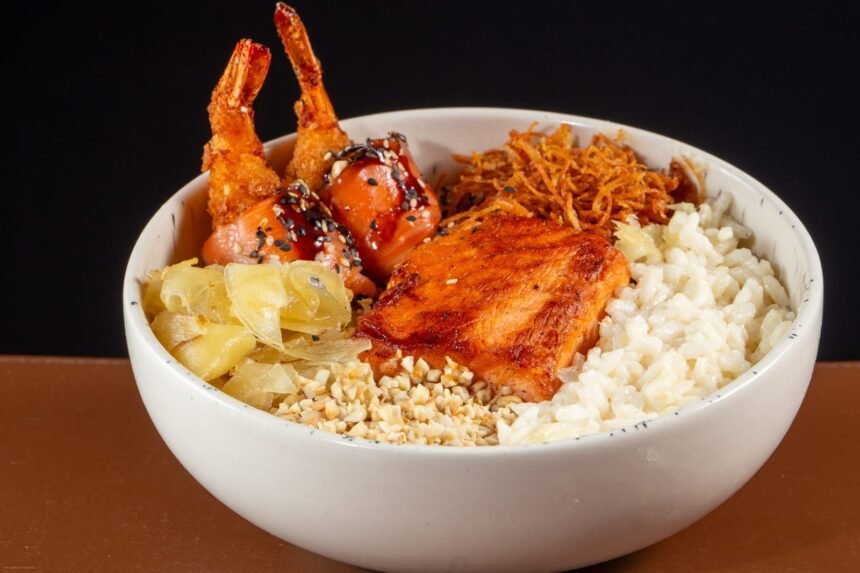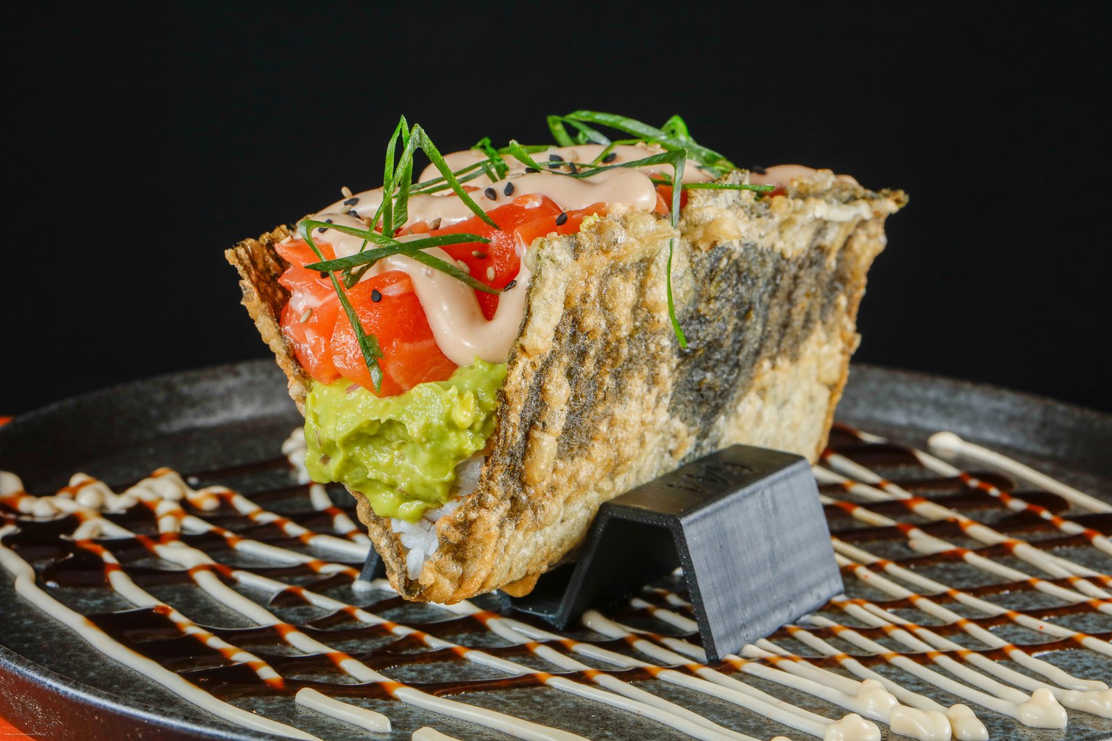 Balli Sushi: Hot Filadélfia (quente e crocante) e Beach Pecado Poke (risoto de gengibre, salmão na chapa, camarão empanado envolto de salmão ao molho teriyaki e gergelim, acompanhado de gengibre caramelizado, farofa de castanha e crispy de batata-doce);